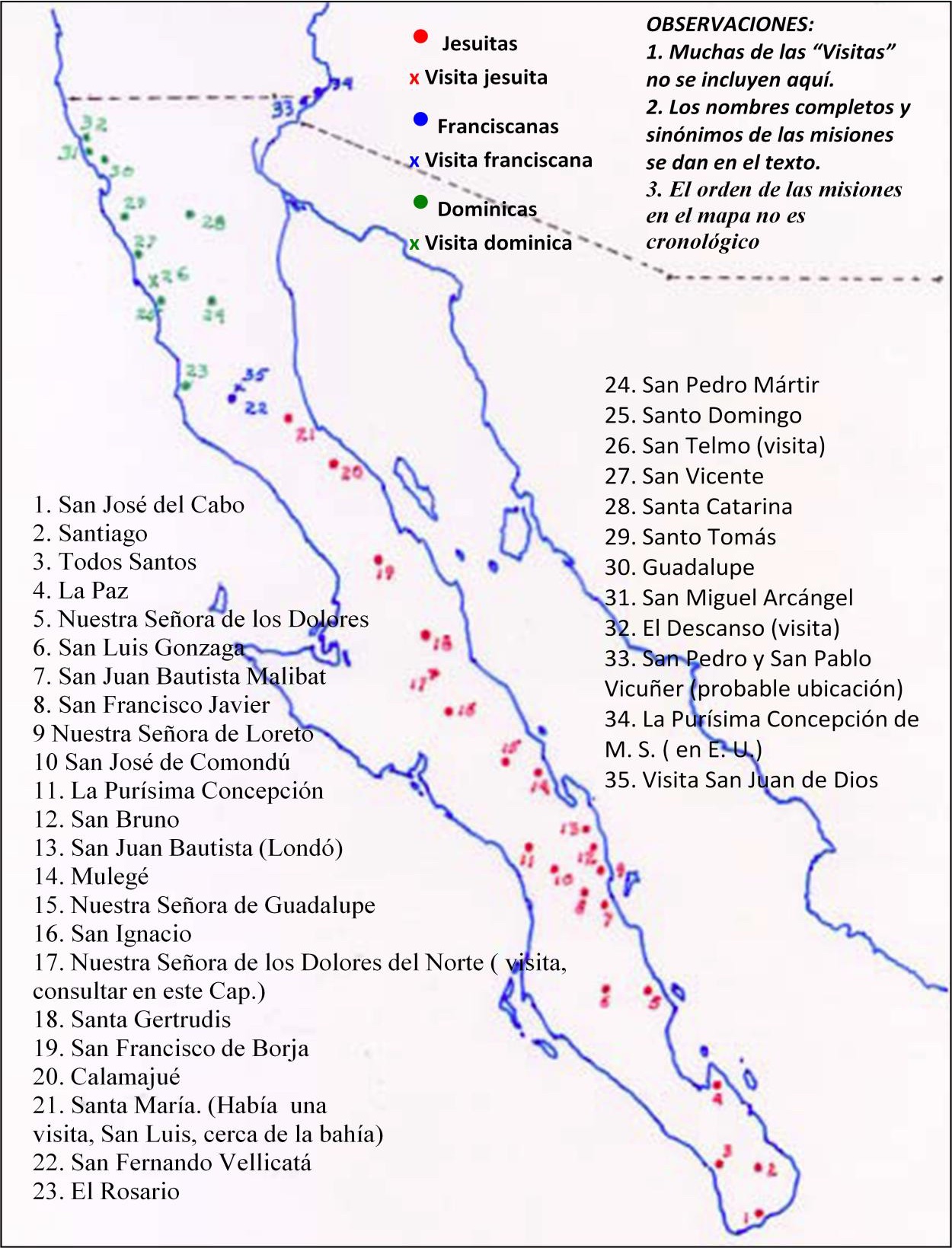 Actualmente el INAH, algunas instituciones particulares4 y la iglesia católica, se han echado a cuestas la tarea de conservar y restaurar lo que queda de ese magnífico legado que los discípulos de Loyola dejaron a la posteridad, incluyendo algunas misiones que los dominicos terminaron de edificar con cantera en Santa Gertrudis y San Francisco de Borja, las cuales inicialmente fueron hechas de adobe, así como San Ignacio, concluida por fray Crisóstomo Gómez. Estas acciones, no por ser generosas y entusiastas pueden considerarse suficientes, pues el gran número de sitios misionales que se encuentran en la península y su lejana ubicación impide, ya no se diga su restauración adecuada, que requiere la participación de expertos nacionales y extranjeros, sino simplemente su vigilancia y elemental cuidado. La relación del mapa que sigue se refiere a las misiones que fundaron los jesuitas en Baja California, incluyendo algunas que funcionaron por muy poco tiempo, otras que nunca se terminaron, así como varias que se abandonaron por diversas causas antes de que procediera la secularización dictada por el gobierno muchos años después. Los datos que se dan, ocasionalmente se repiten y amplían en el capítulo siguiente.