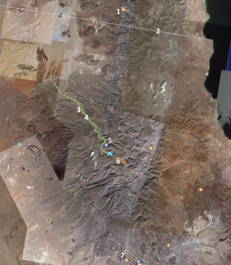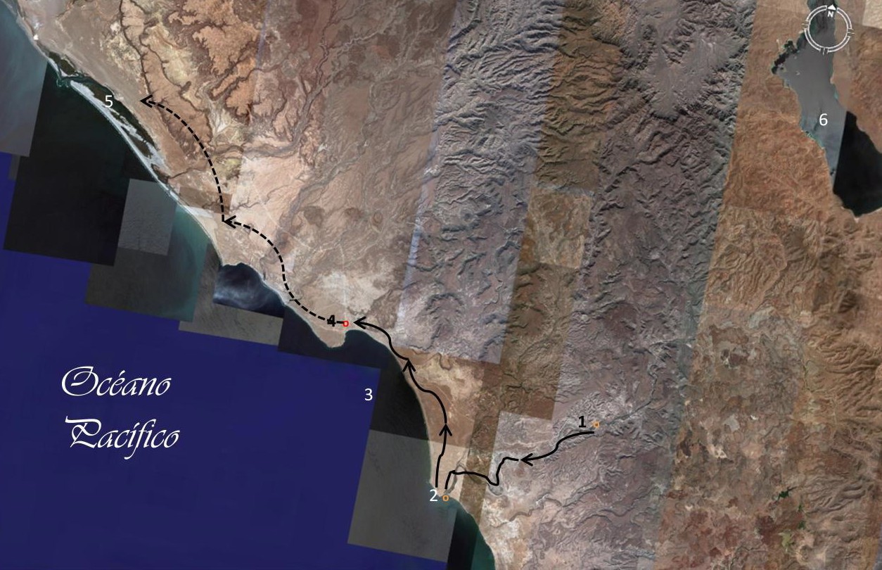 La flecha continua indica la ruta aproximada seguida por el padre Bischoff en su expedición en búsqueda de un puerto en la costa del Pacífico, y la punteada la ruta que habría seguido conforme a la latitud que menciona Barco. Adaptación en mapa de Google Earth.