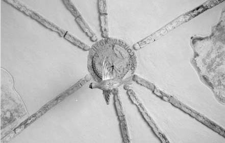 Simbología: I. H S. es el nombre abreviado de Iesus, Jesús; la H es transcripción de la letra mayúscula (IHSOVS), sobre la H está la cruz; abajo se encuentran los 3 clavos que recuerdan la Pasión de Jesucristo; rayos flamígeros rodean los símbolos centrales.