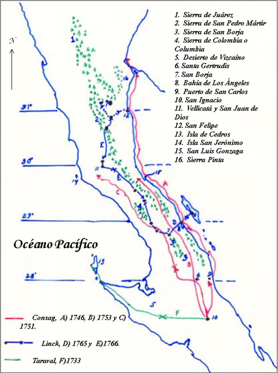 Fernando Consag estaba encargado de la misión de San Ignacio junto con el padre Sistiaga, y en 1746 y 51, acatando las disposiciones del visitador Juan Antonio Baltazar, quien a su vez obedecía la orden del padre provincial Christóbal de Escobar, hizo tres viajes hacia el norte, el primero por mar a la desembocadura del Río Colorado, y después dos por tierra en busca de lugares propicios para establecer misiones e ir buscando la conexión terrestre con las de Sonora; además, se pretendía determinar la naturaleza geográfica de California1, reconocer la costa oriental de la península, y localizar el Estrecho de Anián, cuya existencia, inexplicablemente, aun se aceptaba como una posibilidad muy real.