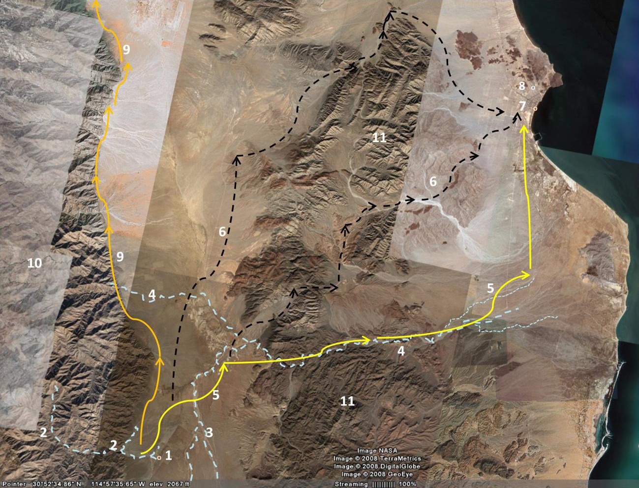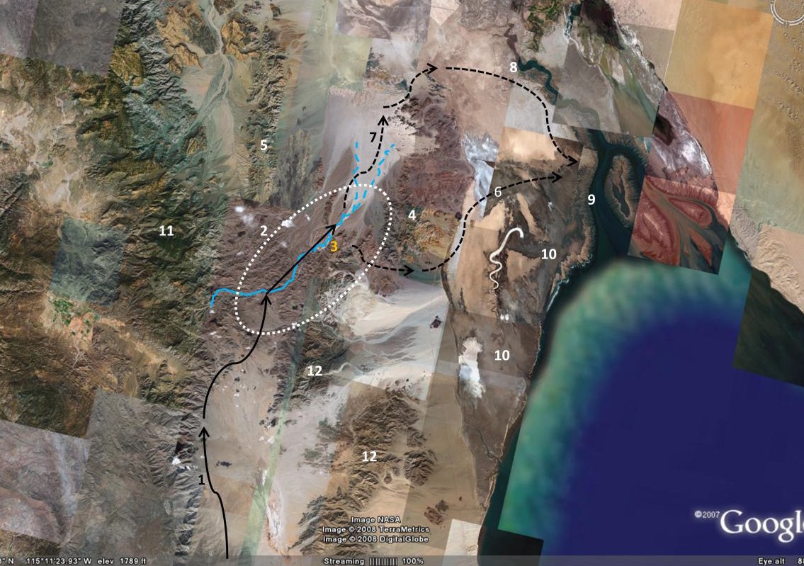 La flecha blanca punteada indica el posible término de la expedición en lo que después fue Santa María de los Ángeles, cerca del arroyo Cabujakaamang. El óvalo blanco punteado indica el área en que se encuentra el lugar del cual, según lo registrado por Linck en su diario, se devolvió el padre Consag en 1751.