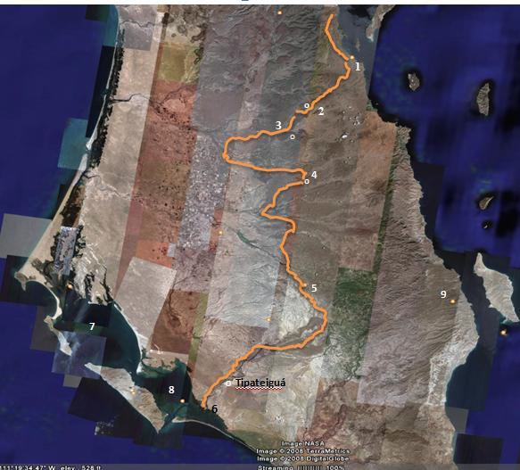 Bocas del Río Colorado. La flecha indica la ruta de las canoas.