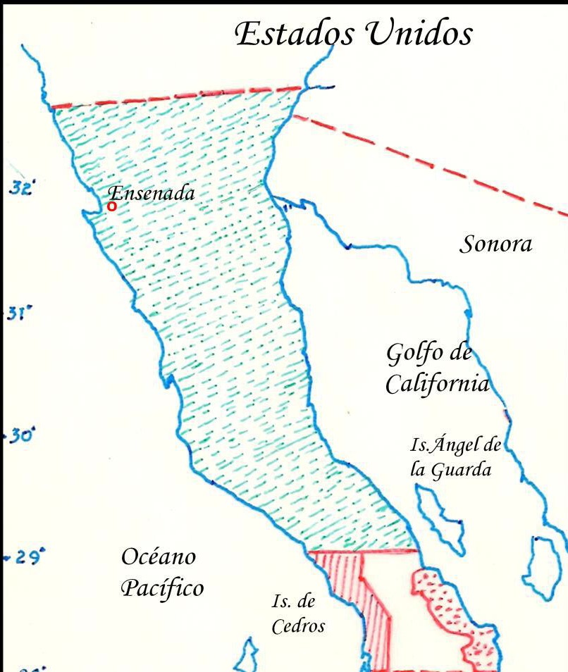 Por este tiempo, el norteamericano Jacob Primer Leese obtuvo la concesión de unas 46 800 millas cuadradas, en Baja California, comprendidas entre los paralelos 24 y 31 de la península. Leese se casó con Rosalía Vallejo, hermana de Mariano Guadalupe Vallejo, mujer admirable y patriota por su carácter decidido y opuesta siempre a los norteamericanos invasores de California. ↩︎