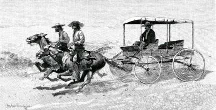 Carruaje del gobernador de la provincia. Los carruajes con los arneses necesarios para que un conductor arreara a las bestias desde el asiento eran raros aun en la Alta California, y era frecuente que tuvieran que ser jalados por uno o dos hombres a caballo. (Imágenes: Cornell University Library)
