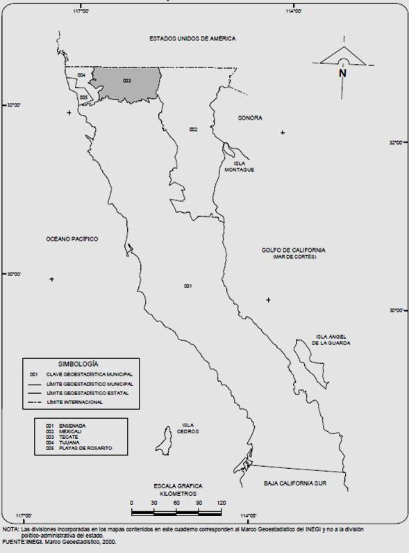 Municipios de Baja California, según el INEGI, en donde se aprecia que Tecate ocupa el tercer lugar en extensión, superado sólo por Ensenada y Mexicali. Falta San Quintín, que recientemente se le ha otorgado la categoría de Municipio.