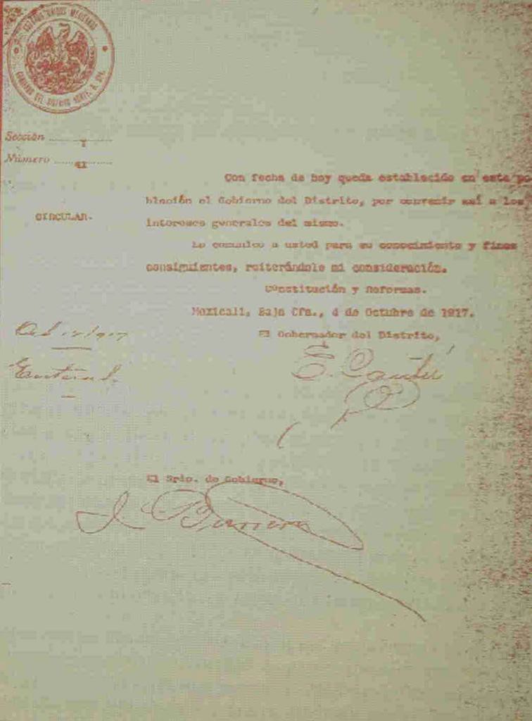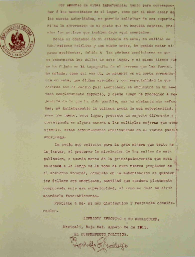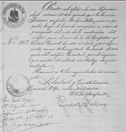 Oficio firmado por el Subprefecto de Mexicali Rodolfo Gallego el 2 de noviembre de 1911. Nótese que el apellido no es ‘Gallegos’ como con frecuencia se menciona en algunas obras.