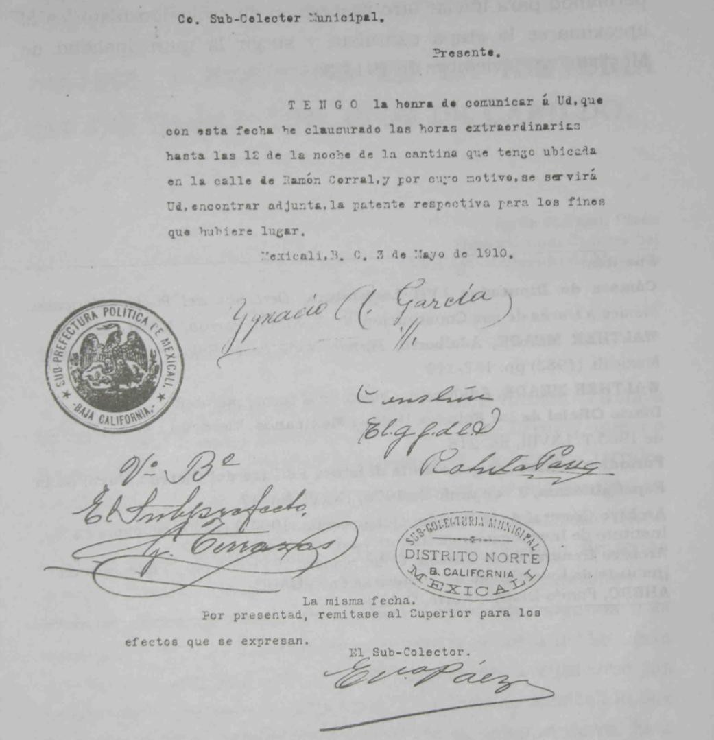 Documento en el cual el señor Ygnacio A. García comunica al subcolector municipal que ha reducido el horario de la cantina de su propiedad. Esto sucedía en 1910, cuando aún era Jefe Político el Coronel Celso Vega, pero ya había peticiones frecuentes al gobierno para que se tomaran medidas en contra de los centros de vicio.