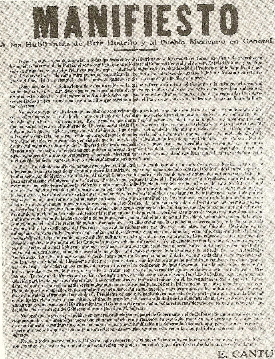 - 1920, 3 de septiembre. Cantú explica desde Los Ángeles en un manifiesto las razones que lo obligan a entregar el gobierno del Distrito pacíficamente a Luis M. Salazar.