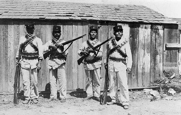La fotografía muestra a cuatro soldados federales del 8º Batallón en Mexicali, durante la intervención magonista, unos dos meses antes de que Cantú llegara a esa plaza. Las tropas a su mando, inicialmente, deben haber mostrado un aspecto semejante, aunque después su presentación mejoró notablemente.