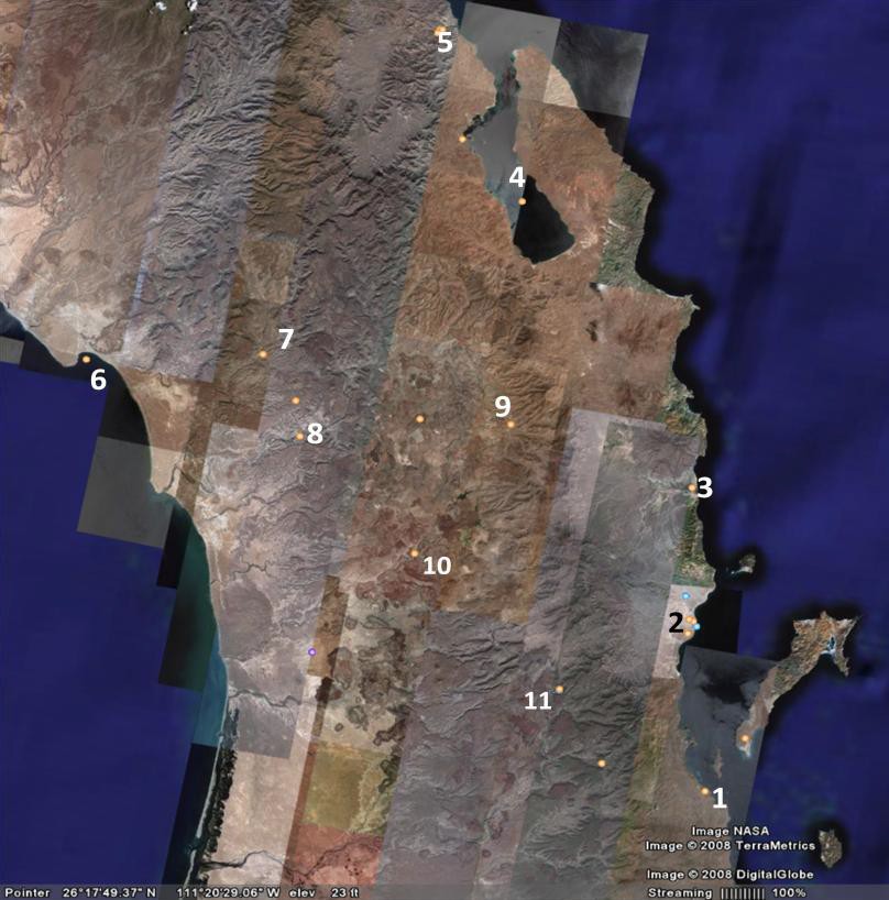 Actualmente el INAH, algunas instituciones particulares4 y la iglesia católica, se han echado a cuestas la tarea de conservar y restaurar lo que queda de ese magnífico legado que los discípulos de Loyola dejaron a la posteridad, incluyendo algunas misiones que los dominicos terminaron de edificar con cantera en Santa Gertrudis y San Francisco de Borja, las cuales inicialmente fueron hechas de adobe, así como San Ignacio, concluida por fray Crisóstomo Gómez. Estas acciones, no por ser generosas y entusiastas pueden considerarse suficientes, pues el gran número de sitios misionales que se encuentran en la península y su lejana ubicación impide, ya no se diga su restauración adecuada, que requiere la participación de expertos nacionales y extranjeros, sino simplemente su vigilancia y elemental cuidado. La relación del mapa que sigue se refiere a las misiones que fundaron los jesuitas en Baja California, incluyendo algunas que funcionaron por muy poco tiempo, otras que nunca se terminaron, así como varias que se abandonaron por diversas causas antes de que procediera la secularización dictada por el gobierno muchos años después. Los datos que se dan, ocasionalmente se repiten y amplían en el capítulo siguiente.