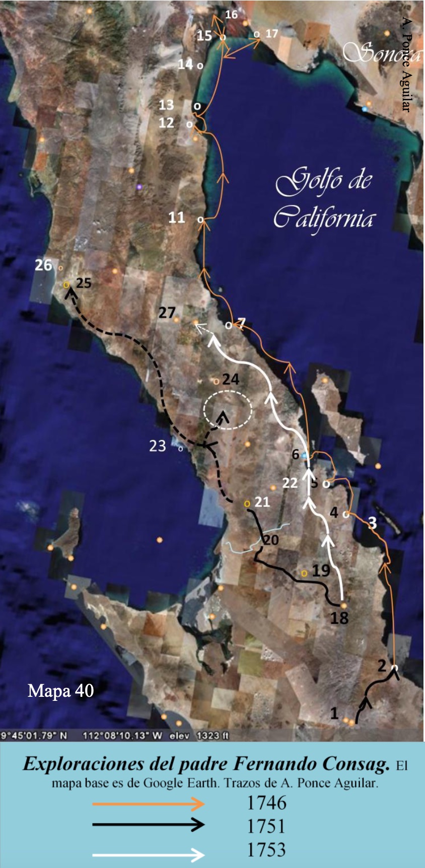 Fernando Consag estaba encargado de la misión de San Ignacio junto con el padre Sistiaga, y en 1746 y 51, acatando las disposiciones del visitador Juan Antonio Baltazar, quien a su vez obedecía la orden del padre provincial Christóbal de Escobar, hizo tres viajes hacia el norte, el primero por mar a la desembocadura del Río Colorado, y después dos por tierra en busca de lugares propicios para establecer misiones e ir buscando la conexión terrestre con las de Sonora; además, se pretendía determinar la naturaleza geográfica de California1, reconocer la costa oriental de la península, y localizar el Estrecho de Anián, cuya existencia, inexplicablemente, aun se aceptaba como una posibilidad muy real.