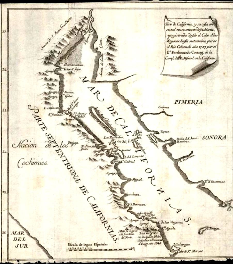 Mapa elaborado por el padre Fernando Consag, publicado en la edición que se hizo en Madrid de la “Noticia de la California y de su conquista temporal y espiritual hasta el tiempo presente”, Madrid, 1757.