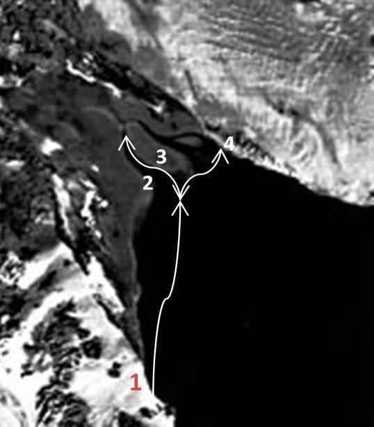 Bocas del Río Colorado. La flecha indica la ruta de las canoas.