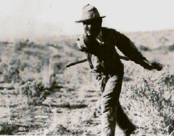 En el poblado La Huerta, municipio de Ensenada, Adolfo Ruiz muestra cómo lanzaban sus antepasados el bumerang de no retorno. Cort. P.C.A.S. Quarterly, 34(3), Summer 1998