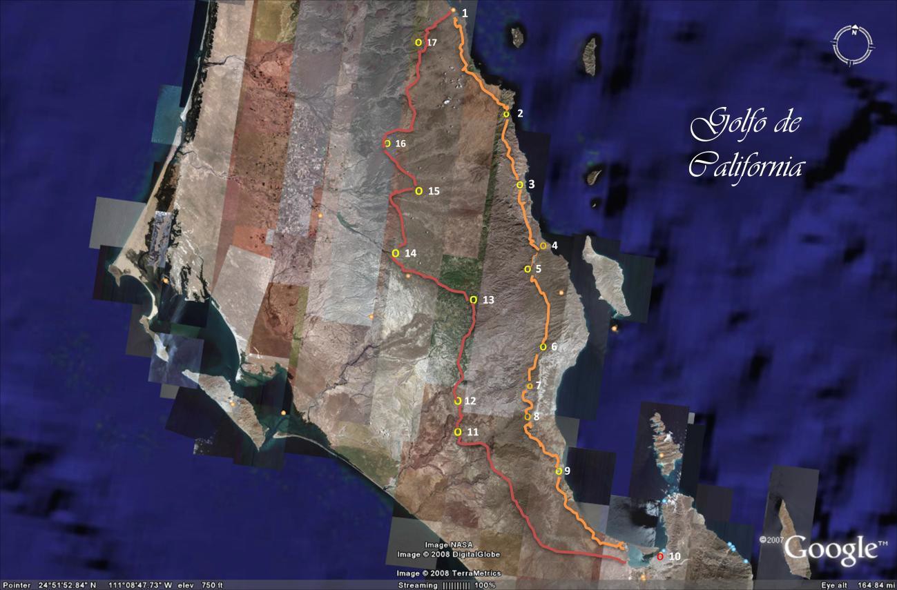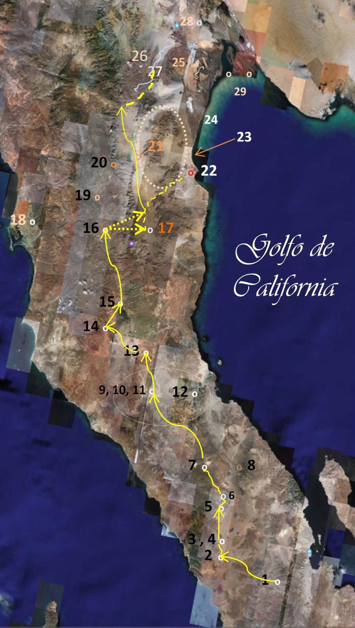Iniciaron la marcha con rumbo aproximado a lo que hoy es Calmallí16, y viajaron dos meses por la vertiente occidental de los montes, sobre todo de la Sierra de San Borja y Columbia, hasta llegar al mar a los 29° 47’ de latitud según su reporte. Si la latitud registrada por Consag fuera verídica, ese lugar de la costa correspondería casi a la Bahía del Rosario, apenas a un poco más de 30 Km. al sur del arroyo El Rosario, que hubiera sido motivo e incentivo suficiente para que los indios guías hubieran informado a los españoles la existencia de la importante corriente que pasaba cerca de allí, y que la expedición viajara unas horas más para llegar hasta ella. Por otra parte, la ubicación geográfica de los distintos parajes por los que pasaron se dificultaba por la constante neblina que propiciaba una reducida visibilidad. Consag afirma que de aquel lugar, en o cercano a la costa, siguieron hacia el noreste a un río del cual los nativos expresaban que traía un gran caudal, y al que después los españoles bautizaron como río Paraíso, como ironía cuando constataron que la afamada corriente era sólo un modesto arroyo que aún conserva ese nombre. La corriente desciende intermitente desde la sierra La Libertad, aproximadamente a los 28º 35´ N.17, y se dirige al suroeste hasta aproximarse a la costa a los 28º 18´ N., casi coincidiendo con el actual poblado de Villa de Jesús María, unos 38 Km. al norte de Guerrero Negro. Cerca del arroyo había algo de tule y una especie de palmeras que producían un fruto parecido a los dátiles, aunque de menor calidad. En este lugar, los nativos que encontraron eran pacíficos, y pidieron al padre que mandara la caballada a pastear más cerca de su ranchería para que sus familias conocieran las hermosas bestias para ellos nunca antes vistas.