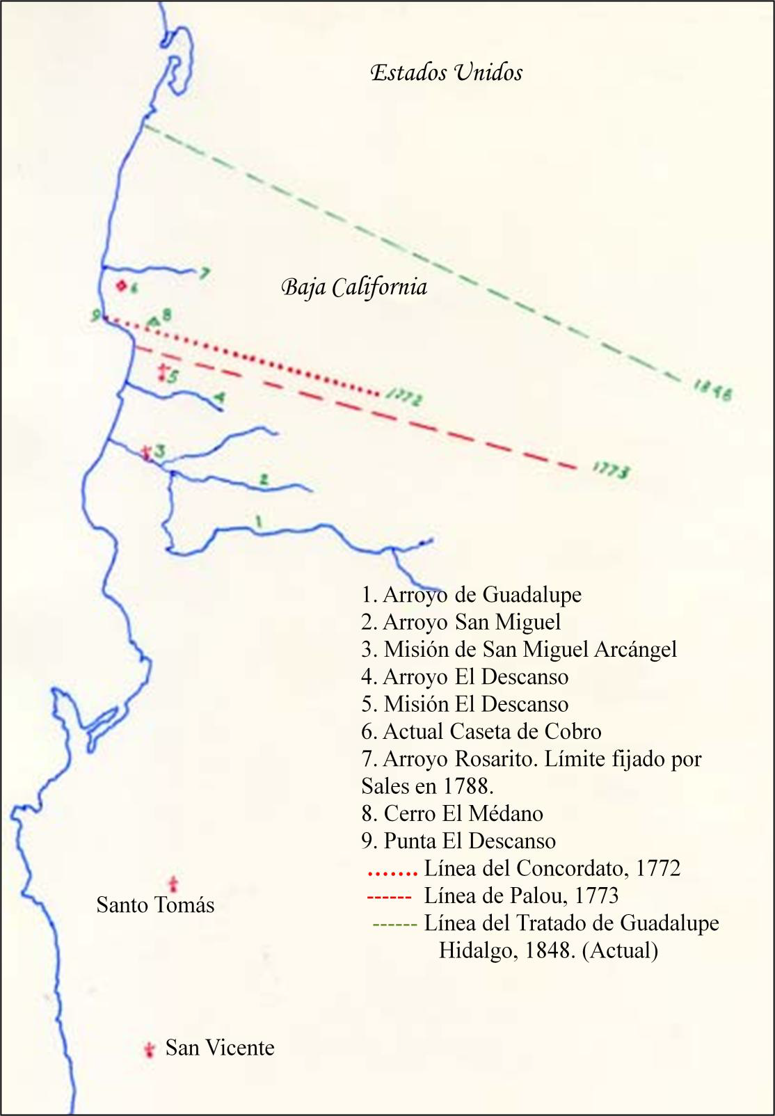 Como resultado de las pláticas sostenidas, los padres Juan Pedro de Iriarte y Laurnaga por los dominicos y Rafael J. Verger por los franciscanos, el 7 de abril de 1772 firmaron un concordato por el cual los fernandinos cedían a los padres predicadores todas las misiones de la península, mientras que ellos se quedarían con las de la Nueva California, comenzando por la de San Diego, documento que fue ratificado por el virrey el día 30 de ese mes; la misión dominica más septentrional se plantaría en el Arroyo de San Juan Bautista, llamado después San Miguel, aunque hoy en su desembocadura se le llama popularmente arroyo de La Misión, y su territorio se extendería 25 Km. al norte de la corriente mencionada, hasta la actual Punta El Descanso5. Como se verá más adelante, años después se dieron circunstancias que hicieron mover la frontera entre dominicos y franciscanos más al norte, hasta el arroyo de El Rosario, cerca del actual municipio de Playas de Rosarito; esta región, la más al norte controlada por los padres predicadores, se llamó desde entonces La Frontera. Se transcribe a continuación parte del concordato mencionado:
