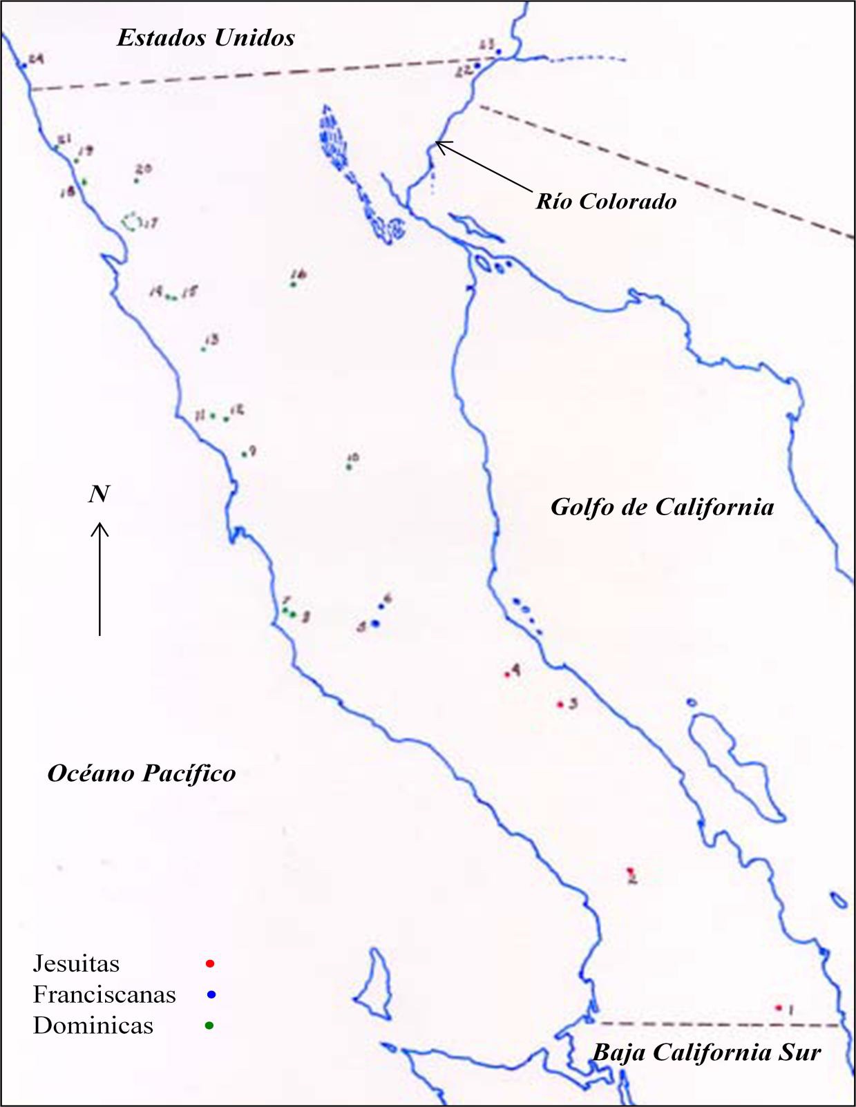 En atención a todo lo dicho, y deseando cumplir puntualmente la soberana voluntad de nuestro católico monarca han convenido en la división siguiente: Que los padres dominicos tomen a su cargo las misiones antiguas que tiene este colegio en California y la nominada frontera de San Fernando de Villacatá siguiendo sus nuevas conversiones por este rumbo hasta llegar a los confines de la misión de San Diego en su puerto poniendo su 6 última misión en el arroyo de San Juan Bautista6, la que finalizará cinco leguas más adelante en una punta que saliendo de la Sierra Madre termina antes de llegar á la playa7, y llegados á ella podrán torcer al Este con poca declinación al Nordeste con lo que deberán salir al fin del golfo californio y río Colorado siguiendo después el rumbo que les señaló Vuestra Excelencia en la real junta. y que los padres del Colegio de San Fernando mantengan las que ocupan desde dicho puerto de San Diego siguiendo el rumbo que tienen para Monterrey, puerto de San Francisco y más adelante8.