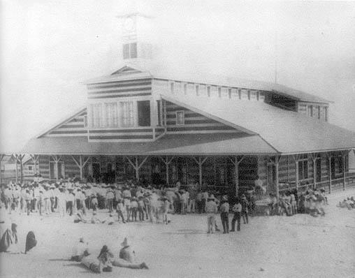 Oficinas centrales de la Compañía ‘El Boleo’, en Santa Roalía, 1910. Los trabajadores que se observan esperan su pago