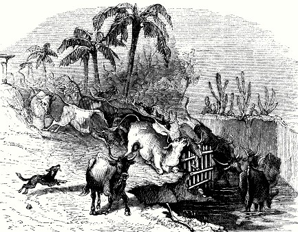 Abrevadero en un rancho del desierto, en el que se aprecian las características del ganado sureño: cornamenta grande, corpulencia y huesos prominentes.