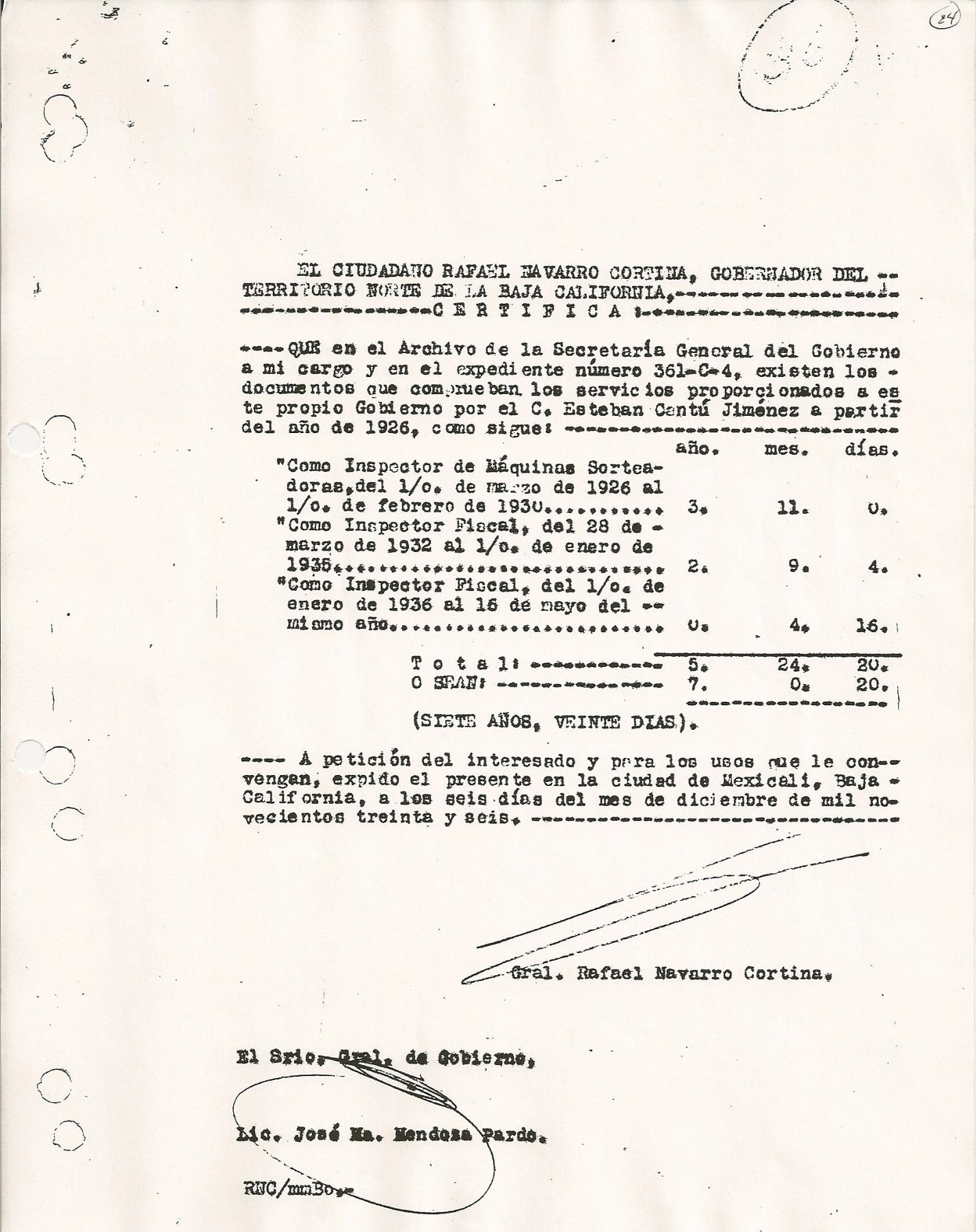 Certificación del gobierno del Territorio Norte de Baja California sobre puestos desempeñados por el Coronel Esteban Cantú, con especificación de sueldos.