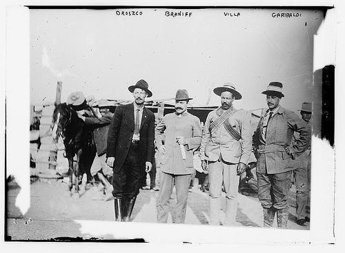 Importantes personajes en la toma de Ciudad Juárez: General Pascual Orozco, el aviador Alberto Braniff, generales Francisco Villa y Guiseppe Garibaldi