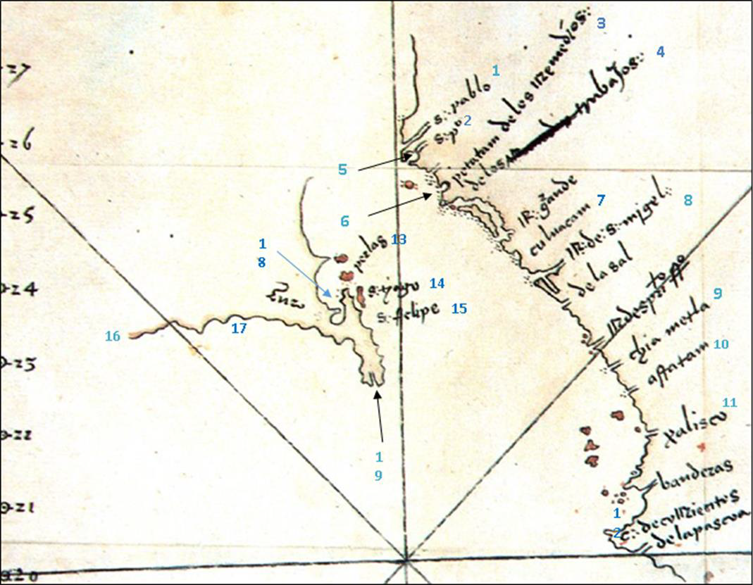siglo XVI.Lo dicho sobre la precisión del mapa se refuerza al observar la considerable congruencia que hay en una carta moderna del litoral de la costa norte de Sinaloa, con el mapa del conquistador, sobre todo la entrada de mar que en el antiguo mapa dice “San Pedro”, apenas abajo de “San Pablo”. Las dos diferentes entradas de mar quizá son dos de las desembocaduras del río Fuerte en la bahía Lechuguilla, pero hay, además, otras tres o cuatro bocas de otras tantas ramas del citado río que desaguan o desaguaban un poco al sur. Myers afirma que la bahía de Topolobampo viene siendo en el mapa de Cortés el río San Pedro. Hay que decir, sin embargo, que importantes autores consideran más viable que el río San Pedro y San Pablo de Cortés sea el actual río Sinaloa, u otro aún más meridional. En resumen, la imprecisión en las latitudes del mapa de Cortés aun admitiendo que fue una carta muy avanzada para su tiempo, los cambios naturales generados en el litoral del noroeste de Sinaloa, los numerosos ríos y afluentes de la zona, y los cambios en las desembocaduras y cursos naturales de varias corrientes por la acción humana, como presas y obras de riego, hacen prácticamente imposible precisar la ubicación de todos los puntos demarcados por el marqués en el litoral sinaloense, por lo que todo lo dicho al respecto debe tomarse con reserva.