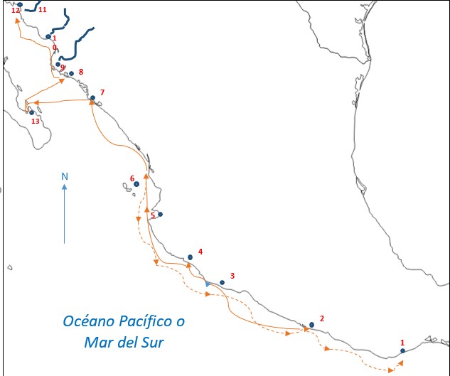 El mismo Cortés, en 1532, había enviado a su primo Diego Hurtado de Mendoza con dos barcos, el “San Marcos” y el “San Miguel”, en una expedición que parece haber llegado hasta aproximadamente los 26° de latitud norte, aunque el navegante pereció en el naufragio de su nave o a manos de los indios habitantes de aquellas costas, y casi todos los marineros, que se habían amotinado, también morirían poco después por causas semejantes. (Ver “De Cueva Pintada a la modernidad”, páginas 93 y 94, de A. Ponce Aguilar, libro en línea). ↩︎